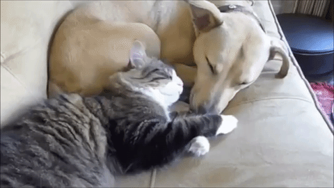 Contradicting every cartoon you’ve ever watched, it would appear cats and dogs can get pretty darn snuggly. Just take a look at these cats getting super close to their canine pals.