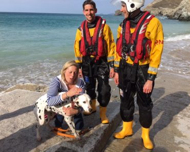 A Dalmatian named has been saved at sea by lifeboat volunteers in St Agnes after falling from a 100ft cliff in Cornwall.