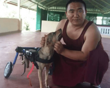 The website sent the monks a Walkin’ Wheels dog wheelchair so that Tashi would not have to spend her life dragging the rear portion of her body around and could enjoy a high quality of life instead.
