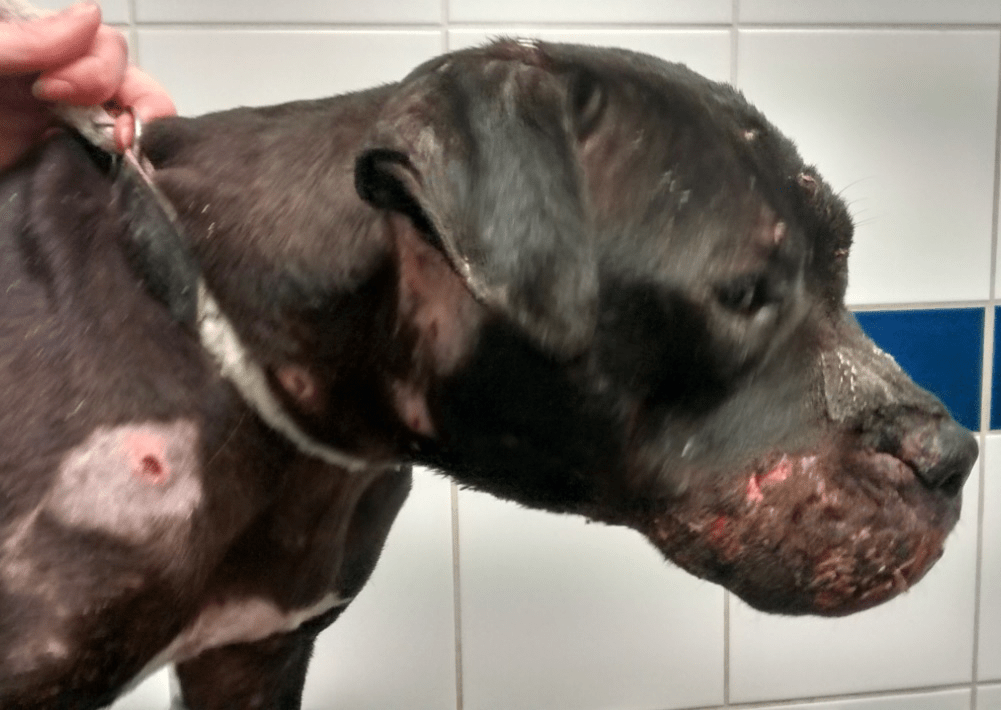 Three-year-old Staffordshire bull terrier cross Kali was found cowering in a garden, in Hertfordshire, in March last year (2017). Vets who assessed her said her injuries were consistent with dog fighting.