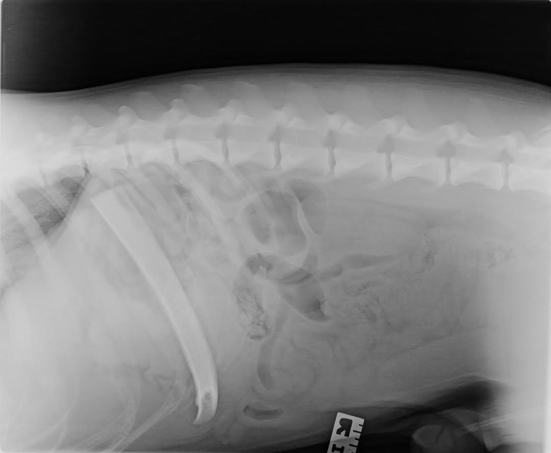 This x-ray of Chico the dog appears to show a ‘spare rib’. But the anomaly was actually down to the greedy pet swallowing a six-inch cow rib bone whole!