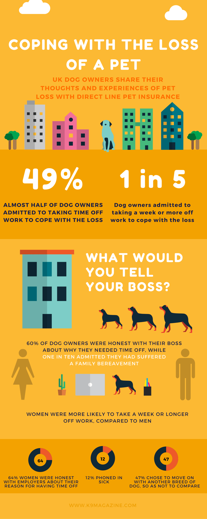 Prit Powar, head of pet insurance at Direct Line, says: “Losing a dog often feels like losing a member of the family and our research shows that dog owners frequently need time at home to deal with their grief. Our policies include a bereavement help-line which helps owners deal with their loss. As a nation of dog lovers, it is important to recognise the emotional impact on someone who has lost a beloved pet and be sympathetic to their loss.”