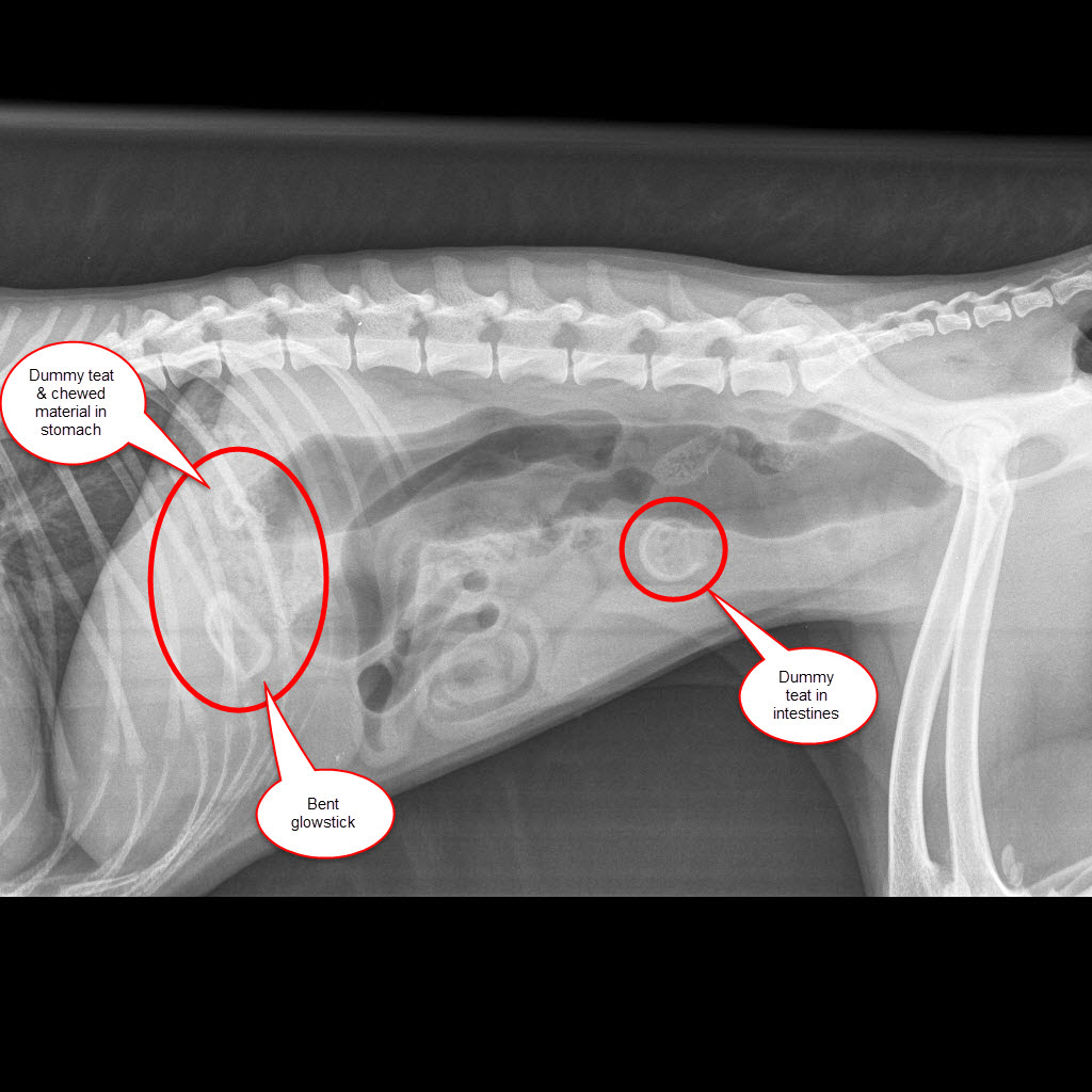 Vets have saved a dog after it gobbled up three dummy teats and a glow stick, which caused a near-fatal blockage in her stomach.