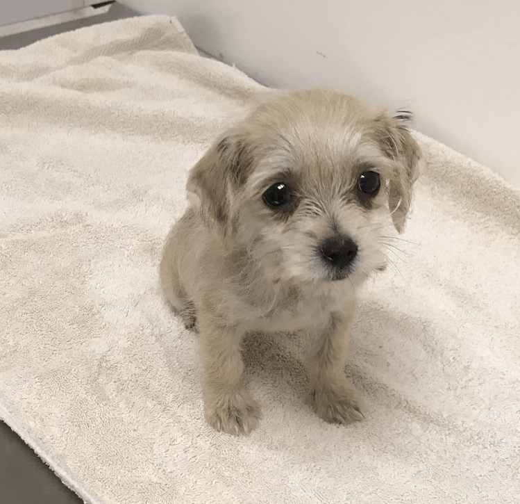 The small, male puppy – thought to be a border terrier cross – initially had some damage to his paws where the hairband had cut off his circulation but has now recovered and seems to be moving well.